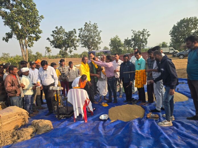 सारंगढ़ बिलाईगढ़, 15 नवंबर 2025,/ विपणन वर्ष 2025-26 में सारंगढ़ विकासखंड के सेवा सहकारी समिति कनकबीरा, कपरतुंगा, नौरंगपुर, कोसीर छोटे, दानसरा, मल्दा ब, अमझर के धान खरीदी केन्द्र में प्राधिकृत अधिकारीयों द्वारा किसानों एवं स्थानीय जनप्रतिनिधियों की उपस्थिति में इलेक्ट्रानिक तौल मशीन का पूजन अर्चना कर धान खरीदी का शुभारंभ किया गया। इस दौरान पूर्व विधायक शमशेर सिंह और गणमान्य नागरिक रामकुमार थूरिया उपस्थित थे। इसी प्रकार खाद्य अधिकारी गणेश कुर्रे की उपस्थिति में बिलाईगढ़ ब्लॉक के उपार्जन केंद्र धनसीर में धान खरीदी प्रारम्भ किया गया। अधिकारियों ने इस दौरान किसानों का सम्मान किया गया।