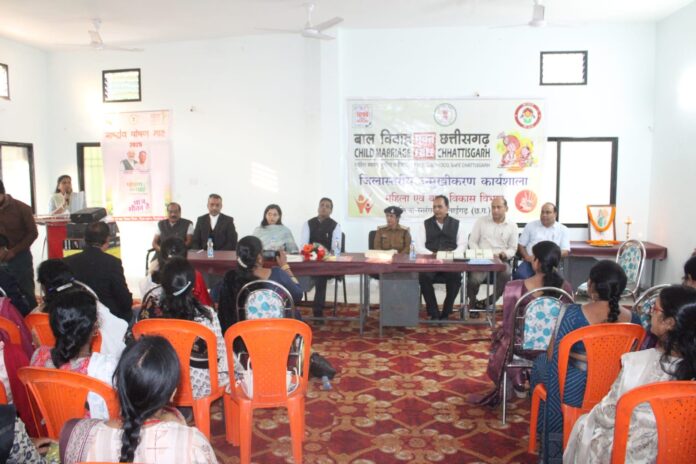 सारंगढ़-बिलाईगढ़,कलेक्टर डॉ संजय कन्नौजे की अध्यक्षता में परियोजना कार्यालय सारंगढ़ में “बाल विवाह मुक्त छत्तीसगढ़” के तहत जिला स्तरीय उनमुखीकरण कार्यशाला का आयोजन किया गया। कलेक्टर डॉ कन्नौजे ने छत्तीसगढ़ महतारी के छायाचित्र के समक्ष दीप प्रज्जवलित कर कार्यक्रम का शुभारम्भ किया। इस दौरान पुलिस, समाज कल्याण और विधि विभाग से आए अतिथियों ने बाल विवाह मुक्त विषय पर अपने व्याख्यान दिए। साथ ही लघु फ़िल्म का प्रदर्शन कर जागरूक किया गया। साथ ही बाल विवाह मुक्त का शपथ लिया गया। इस कार्यशाला में डिप्टी कलेक्टर शिक्षा शर्मा, उप संचालक विनय तिवारी, पुलिस, अधिवक्तागण, महिला एवं बाल विकास अंतर्गत अधिकारियों में बृजेन्द्र ठाकुर, कृष्ण कुमार साहू, रजनी (विधिक परिवीक्षा), शालिनी सिंह (सखी सेंटर), पायल साहू (बाल संरक्षण), पर्यंवेक्षक विजेता केशरवानी, गीता नायक आदि उपस्थित थीं।