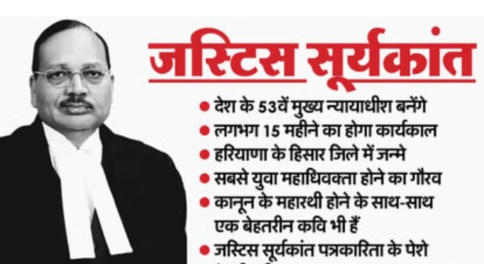 जस्टिस सूर्यकांत सोमवार को देश के 53वें मुख्य न्यायाधीश (सीजेआई) के रूप में शपथ लेंगे। वह जस्टिस बीआर गवई की जगह लेंगे। जस्टिस सूर्यकांत जम्मू-कश्मीर का विशेष दर्जा खत्म करने वाले अनुच्छेद 370 को हटाने, बिहार मतदाता सूची समीक्षा व पेगासस स्पाइवेयर केस जैसे कई अहम फैसलों का हिस्सा रहे हैं। वह 9 फरवरी, 2027 को सेवानिवृत्त होंगे। बतौर सीजेआई उनका कार्यकाल करीब 15 माह का होगा।
