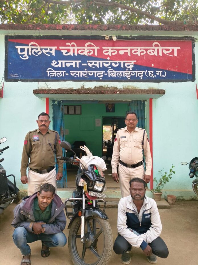 दिनांक 01/12/2025 को वाहन चेकिंग के दौरान एक काले रंग के मोटर सायकल मे सवार दो व्यक्ति कनकबीरा सराईपाली तरफ से आ रहा था पुलिस को देखकर मोटर साइकिल चालक मोटरसाइकिल को पीछे घूमा कर भागने का प्रयास किया जिसे दौड़कर पकड़ा गया पूछताछ करने पर टालमटोल कर मोटरसाइकिल के पीछे बंधे थैला के बारे में पूछने पर अवैध गांजा बिक्री हेतु परिवहन करना बताएं जिससे एनडीपीएस के सम्पूर्ण प्रावधानों के तहत विधिवत कार्यवाही कर उनके कब्जे से 01 किलो 500 ग्राम अवैध मादक पदार्थ गांजा कीमती 15000रु,एक मोटर सायकल क्रमांक CG 06 HD 0309 कीमती 100000 रु, जुमला कीमती 250000रु को जप्त कर आरोपीयों के खिलाफ चौकी कनकबीरा मे अपराध क्रमांक 626/2025 धारा 20 बी एनडीपीएस एक्ट पंजीबद्ध कर आरोपीयों को न्यायिक रिमांड पर जेल भेजा गया