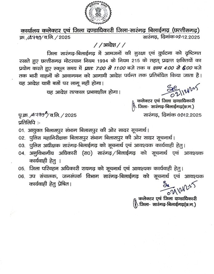 सारंगढ़-बिलाईगढ़, 4 दिसंबर 2025/कलेक्टर एवं जिला दंडाधिकारी डॉ संजय कन्नौजे ने सारंगढ़ बिलाईगढ़ जिले के आम जनों की सुरक्षा एवं दुर्घटना से बचाव को ध्यान में रखते हुए छत्तीसगढ़ मोटरयान नियम 1994 के नियम 215 के तहत प्रदत्त शक्तियों का प्रयोग करते हुए स्कूल समय में प्रातः 7 से 11 बजे तक और शाम को 4 से 6 बजे तक भारी वाहनों के आवागमन को आगामी आदेश पर्यंत तक प्रतिबंधित किया है। यह आदेश यात्री बसों को छोड़कर बाकी सब भारी वाहनों पर तत्काल प्रभाव से लागू होगा।